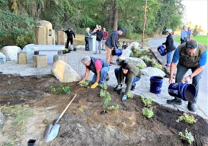 Dwight's friends and family, members of his Sunrise Rotary Club of Coeur d'Alene, and the crew at Clearwater Summit Group, planting native grasses and foliage at the Dwight Bershaw memorial in October of 2022.