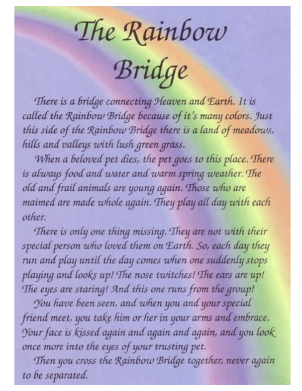 "Rainbow Bridge," by artist Jason Thunderbird was donated to the Coeur d'Alene Arts Commission by the Kootenai County Dog Park Association in 2016. The hand-cut, heat-treated metal sign is reminiscent of the poem entitled "The Rainbow Bridge," author unknown. The art piece is located just outside of the gated dog park in McEuen Park, downtown Coeur d'Alene.
