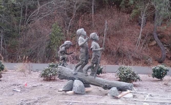 In the artist's own words, "The act of make-believe is something we all can gravitate toward. Creating worlds in which we rule as we play in nature is a universal childhood game. The Explorers depicts three children balancing their way across a fallen tree. Their attitude makes one think they have just defeated the imaginary dragon and are on their victorious route home. . . . My theme speaks of family and community and a positive affirmative of life. My sculptures reflect the importance of raising children who fulfill their individual potential, live in service to their community, and exercise loving stewardship over the environment."